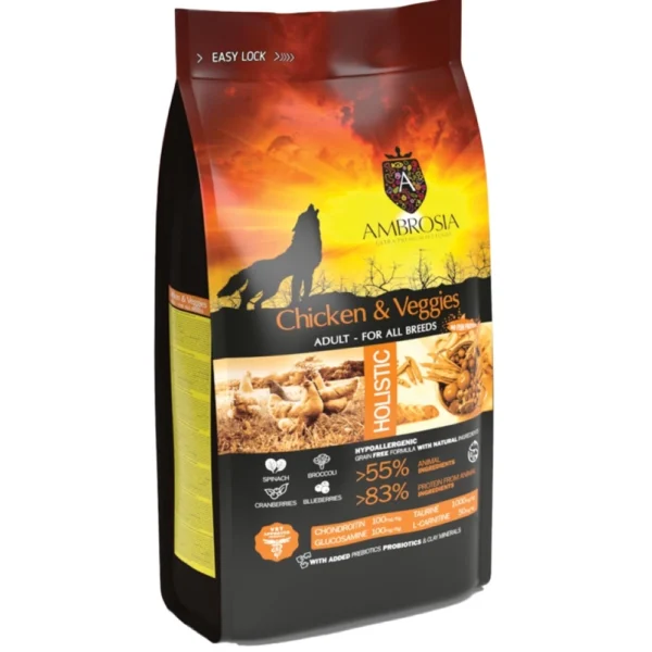 Η Ambrosia Grain Free Adult Chicken & Vegies είναι μια ολιστική τροφή για ενήλικους σκύλους, φτιαγμένη με φρέσκο κοτόπουλο και επιλεγμένα λαχανικά.